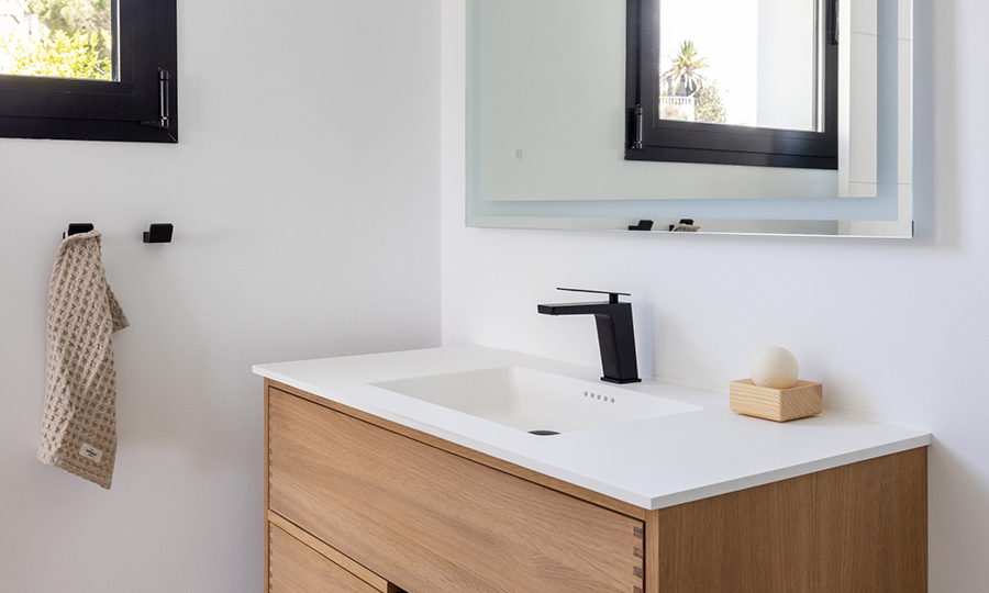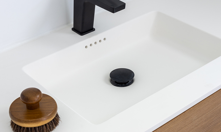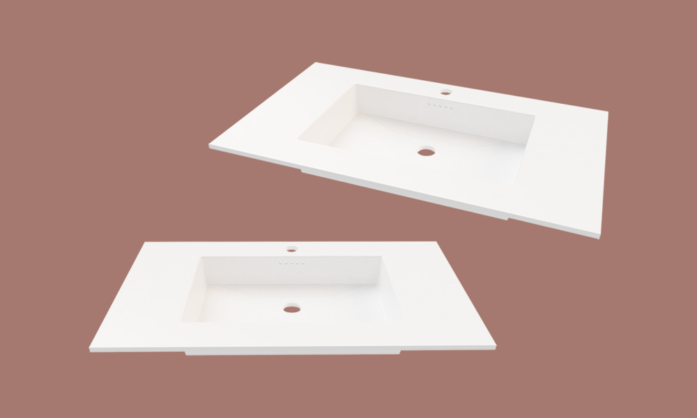 Solid Surface Bathroom CountertopsThe MaterialSolid Surface is composed of a homogeneous composite material, made from a unique blend of color pigments, acrylic, polyester, and aluminum powder (ATH), extracted from natural bauxite ore. Solid Surface is exceptionally durable and has an easy-to-clean and bacteria-resistant surface with a beautiful silk-matte finish. Installation The countertop should be carried upright on its back edge. The countertop must NOT be carried while lying flat. Cleaning and CareCleaning is done with warm water and ordinary household cleaning agents. We recommend Marmorline Cleaner, but you can also use dish soap or similar. For stubborn stains, use concentrated cleaning agent or Marmorline Scrub Sponge. Do not use scouring cream, dry scouring powder, metal pot sponges, or steel wool. DetailsOur standard Solid Surface countertops come in color 110 Arctic White. The plates are uniformly colored white, enabling elegant solutions where five small overflow holes are drilled in a row. RepairSolid Surface is a strong and durable material. Should the plate sustain minor damages such as fine scratches, these can often be polished away. If the scratches are only "cobweb scratches" (not deep scratches), they can most likely be polished away with a felt pad. If that is not enough, the plate can be wet-sanded with an electric sander. Environment and Responsibility Marmorline is a Danish company that produces the plates at its own factories. All countertops from Marmorline have, among others, the following distinctions: |