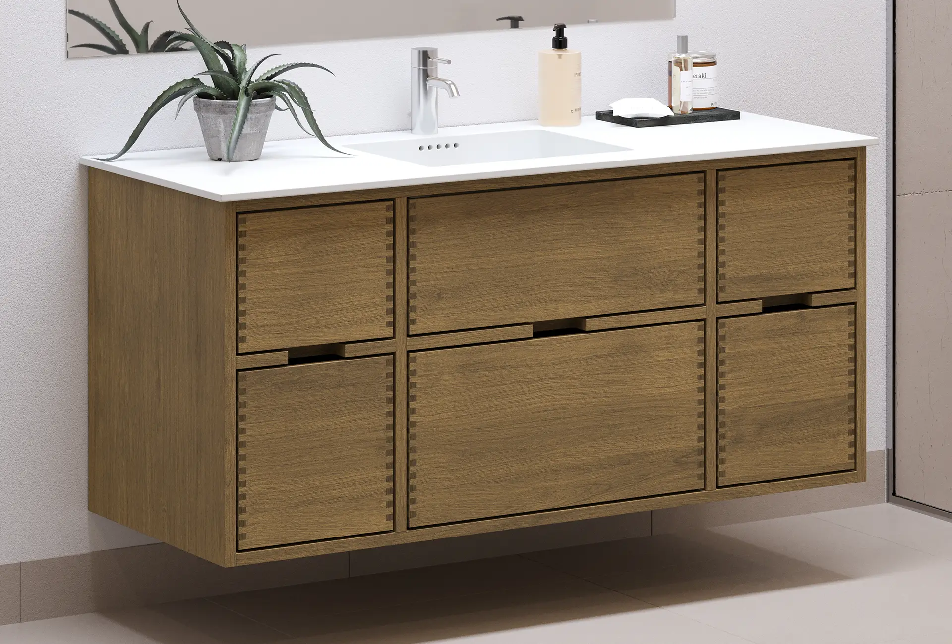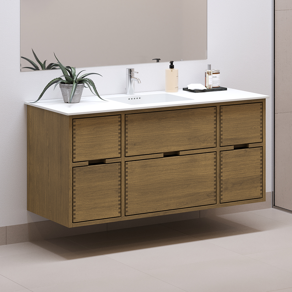This carpenter bathroom furniture has 6 drawers. The furniture is made with solid, oiled, and finger-jointed oak drawers with beautiful details. The drawers are made with full extension and soft close and come with a wash cutout in the top drawer and full depth in the bottom drawer.