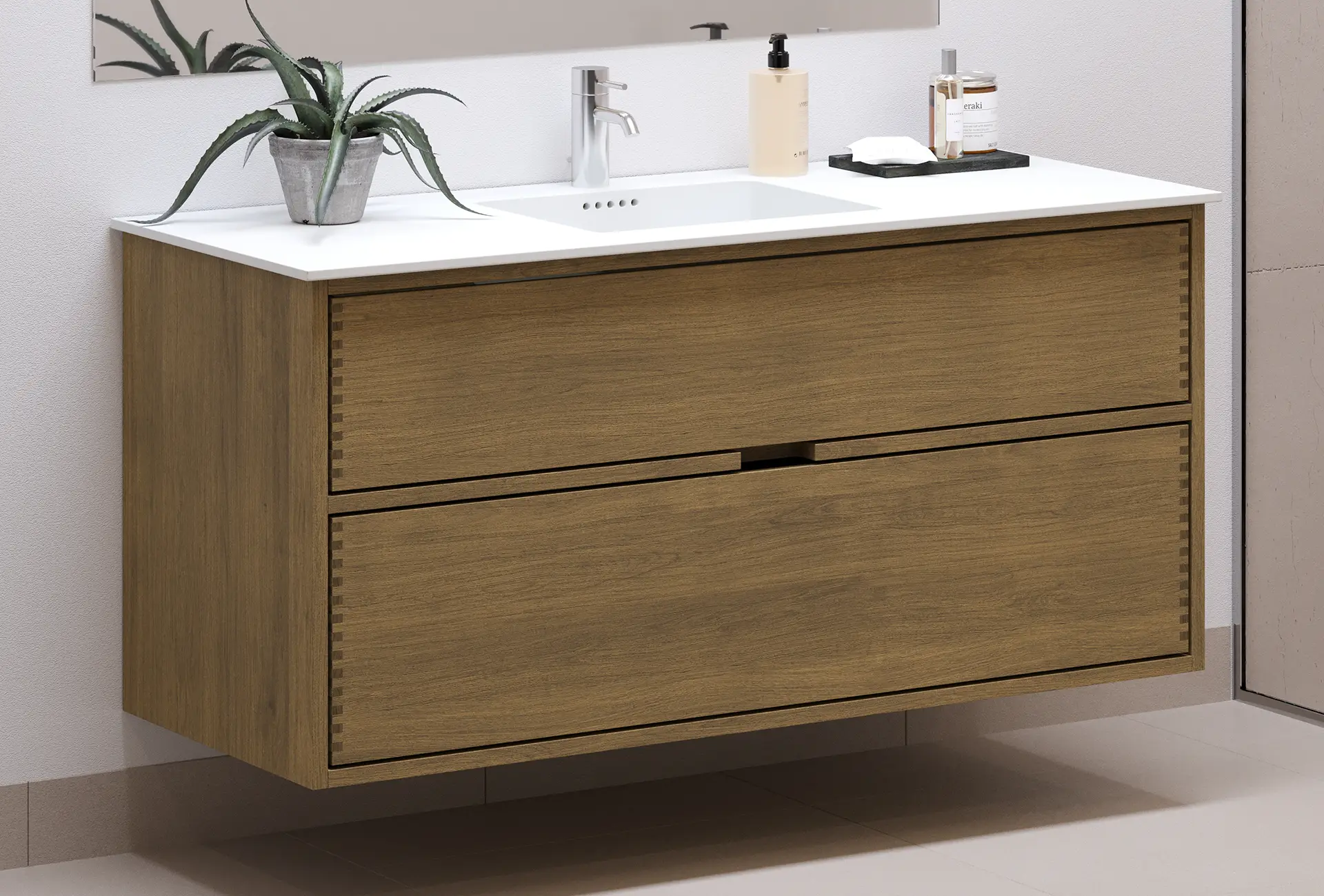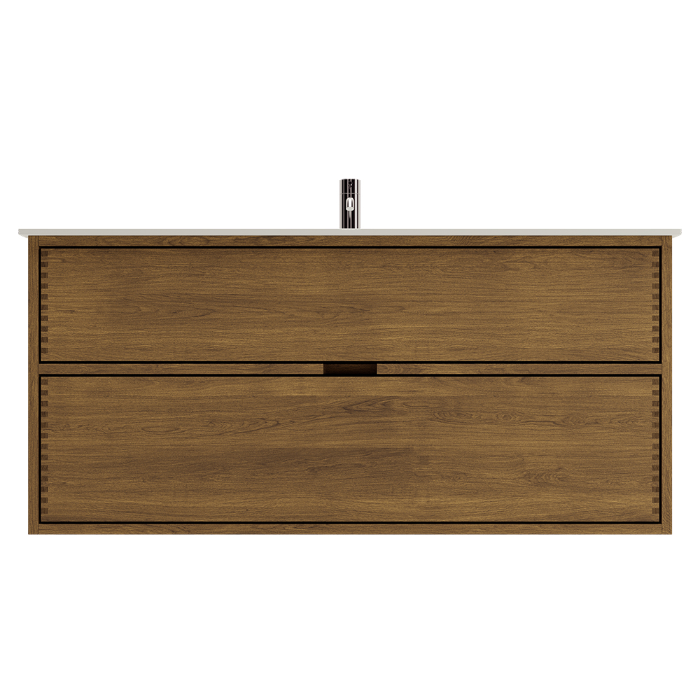 This carpenter's bathroom furniture has 2 drawers. The furniture is made with solid, oiled, and finger-jointed oak drawers with beautiful details. The drawers are made with full extension and soft close and come with a sink cutout in the top drawer and full depth in the bottom drawer.