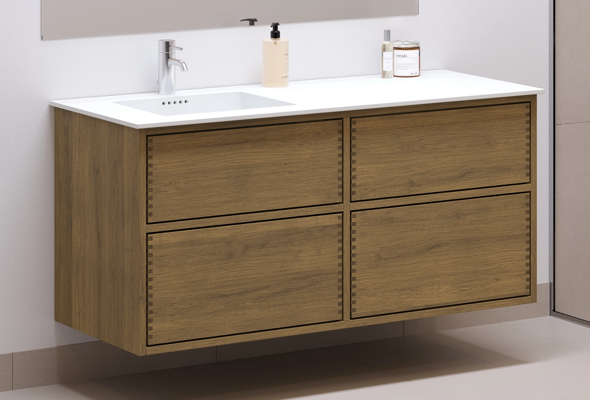 This carpenter bathroom furniture has 4 drawers with push to open. The furniture is made with solid, oiled, and finger-jointed oak wood drawers with beautiful details. The drawers are made with full extension and soft close and come with a sink cutout in the top drawer and full depth in the bottom drawer.