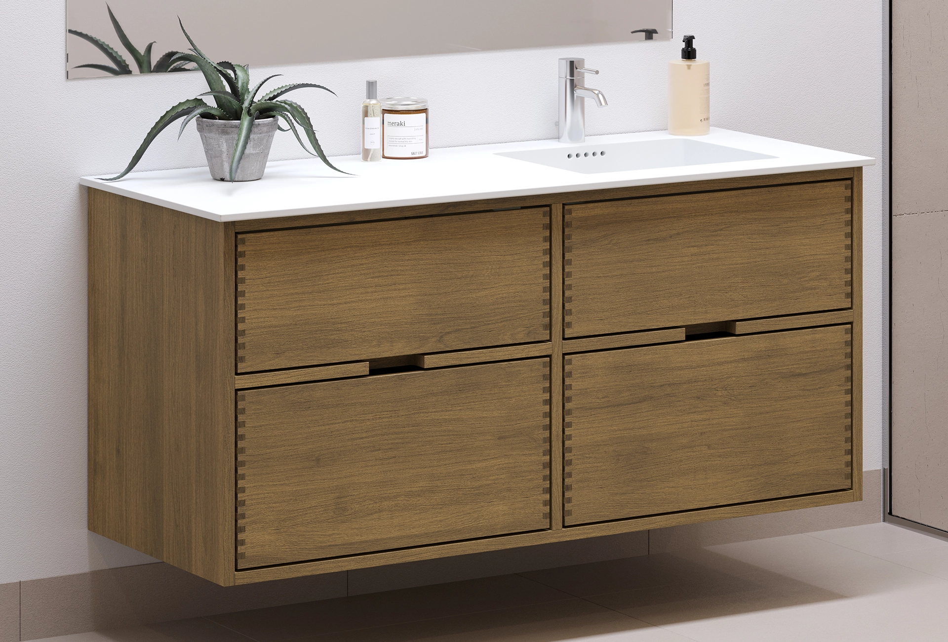 This carpenter bathroom furniture has 4 drawers. The furniture is made with solid, oiled and finger-jointed oak drawers with beautiful details. The drawers are made with full extension and soft close and come with a sink cutout in the top drawer and full depth in the bottom drawer.