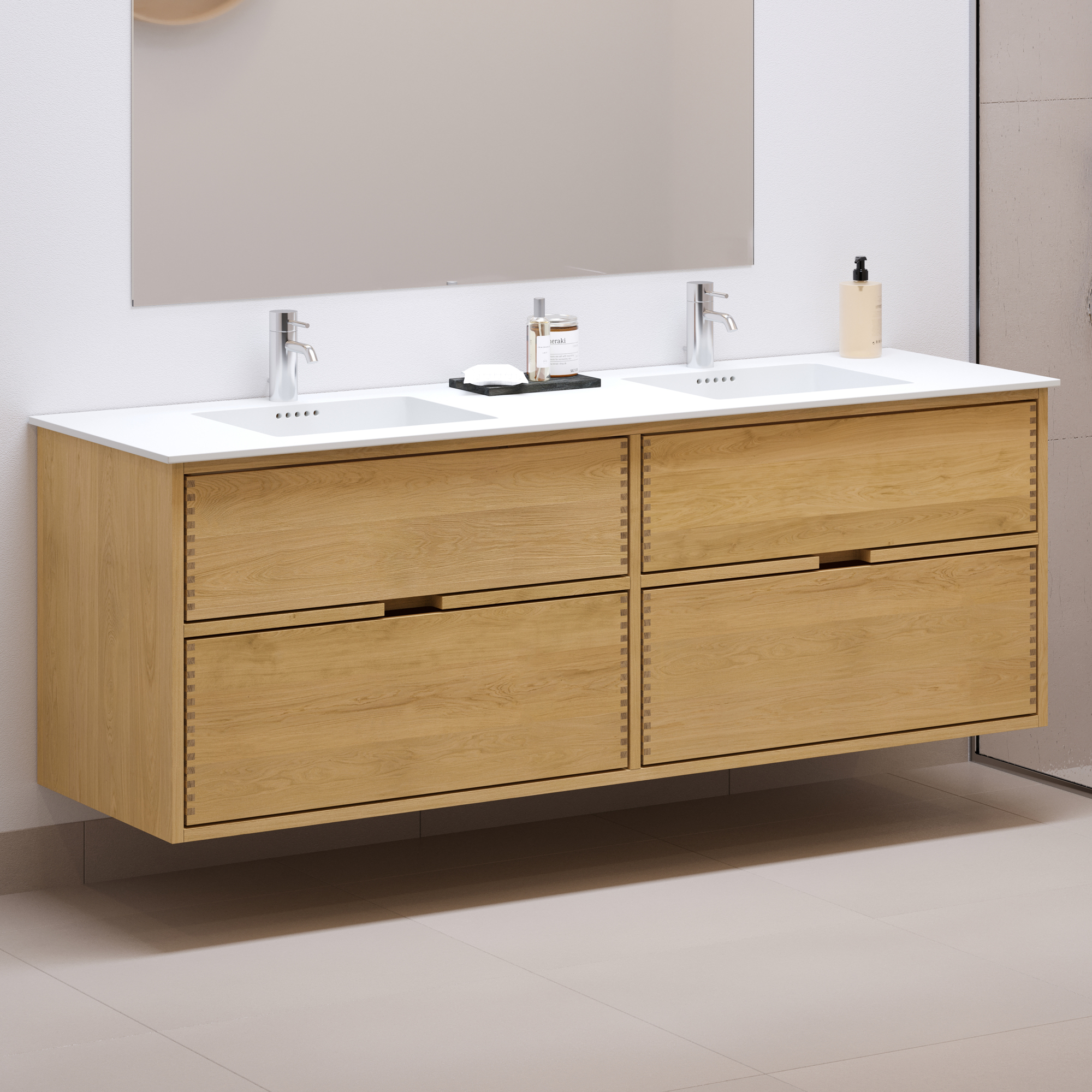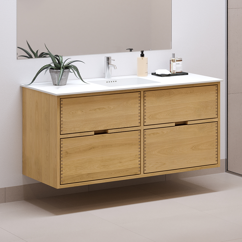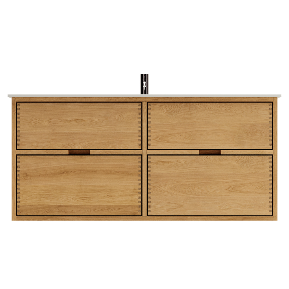 This carpenter bathroom furniture has 4 drawers. The furniture is made with solid, oiled, and finger-jointed oak drawers with beautiful details. The drawers are made with full extension and soft close and come with a sink cutout in the top drawer and full depth in the bottom drawer.