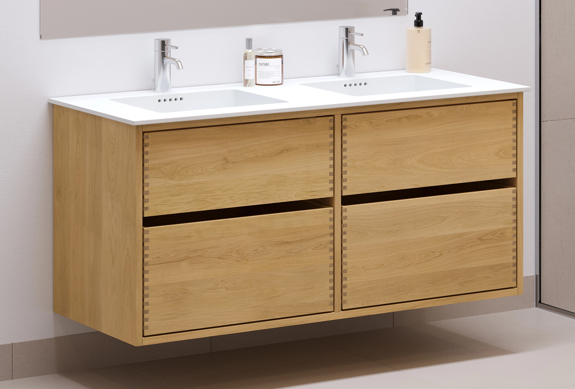 This carpenter bathroom furniture has 4 drawers. The furniture is made with solid, oiled, and finger-jointed oak drawers with beautiful details. The drawers have full extension and soft close, and one drawer has a sink cutout while the rest of the drawers have full depth.