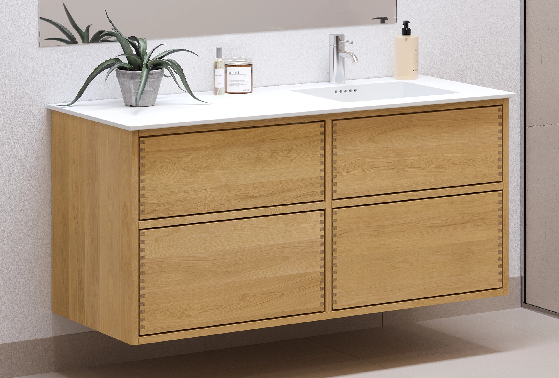 This carpenter bathroom furniture has 4 drawers with push to open. The furniture is made with solid, oiled, and finger-jointed oak drawers with beautiful details. The drawers are made with full extension and soft close and come with a wash basin cutout in one drawer and full depth in the rest of the drawers.