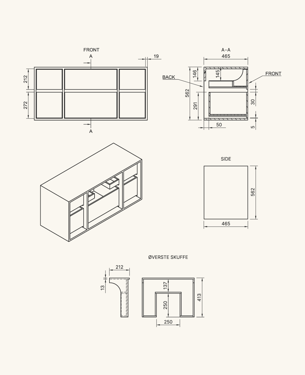 The wooden drawers are made with sturdy 13 mm sides, where the top drawer is blocked and permanently mounted, leaving space for the sink behind. The middle drawer is made with a cutout for the sink, allowing space for the drain. The bottom drawer is made with extra depth, so you can really utilize the space.