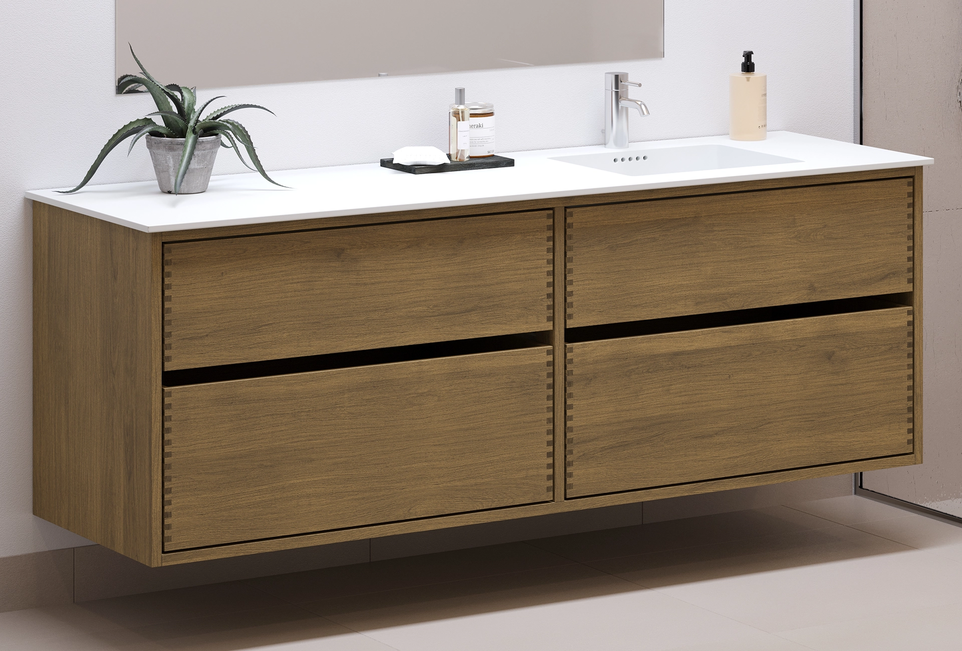 This carpenter bathroom furniture has 4 drawers. The furniture is made with solid, oiled, and finger-jointed oak drawers with beautiful details. The drawers are made with full extension and soft close and come with a sink cutout in the top drawer and full depth in the bottom drawer.
