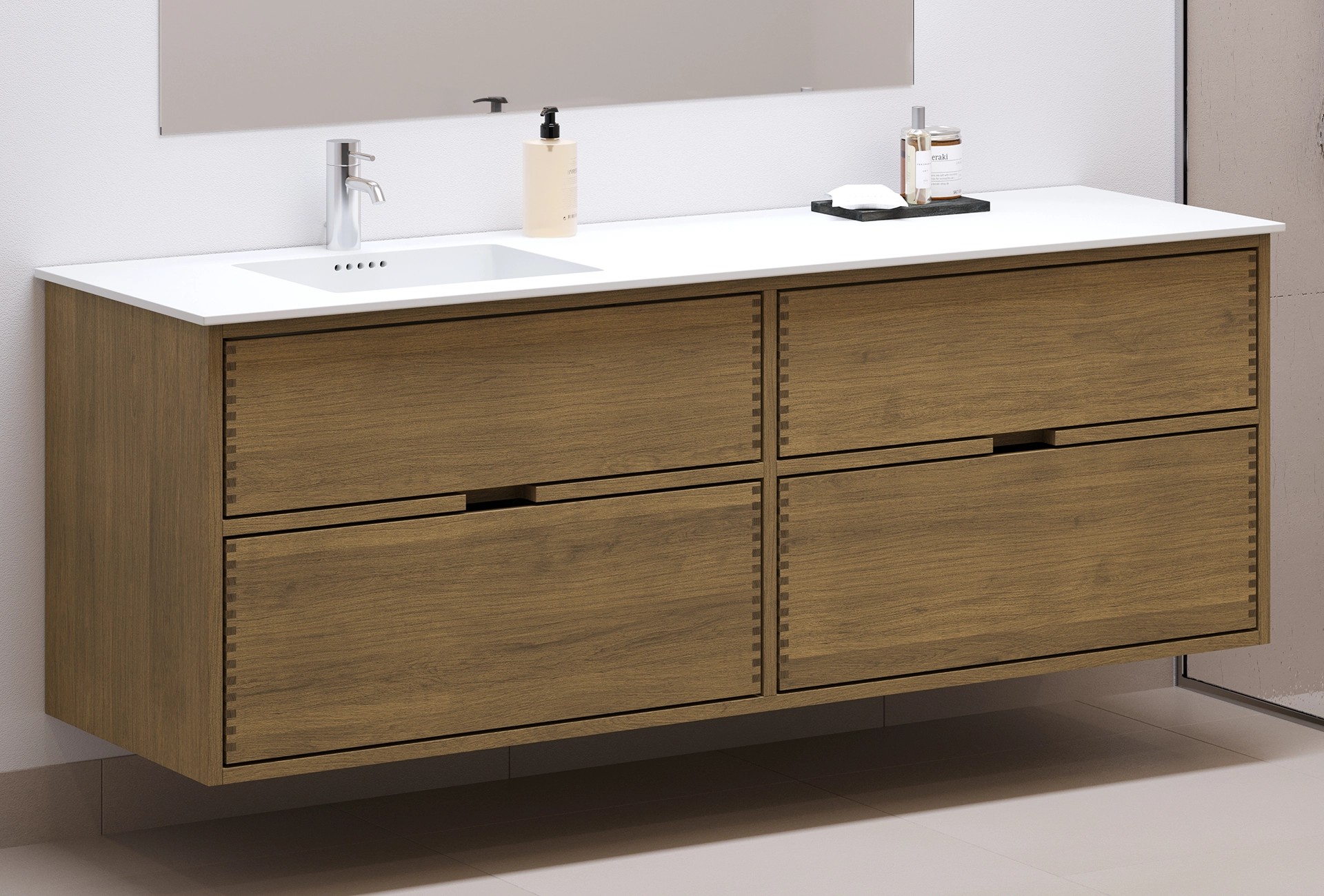 This carpenter's bathroom furniture has 4 drawers. The furniture is made with solid, oiled, and finger-jointed oak drawers with beautiful details. The drawers are made with full extension and soft close and come with a wash cutout in the top drawer and full depth in the bottom drawer.