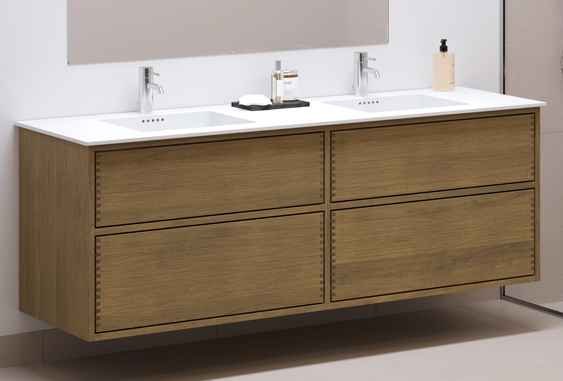 This carpenter bathroom furniture has 4 drawers with push to open. The furniture is made with solid, oiled, and finger-jointed oak drawers with beautiful details. The drawers are made with full extension and soft close and come with a wash cutout in the top drawer and full depth in the bottom drawer.