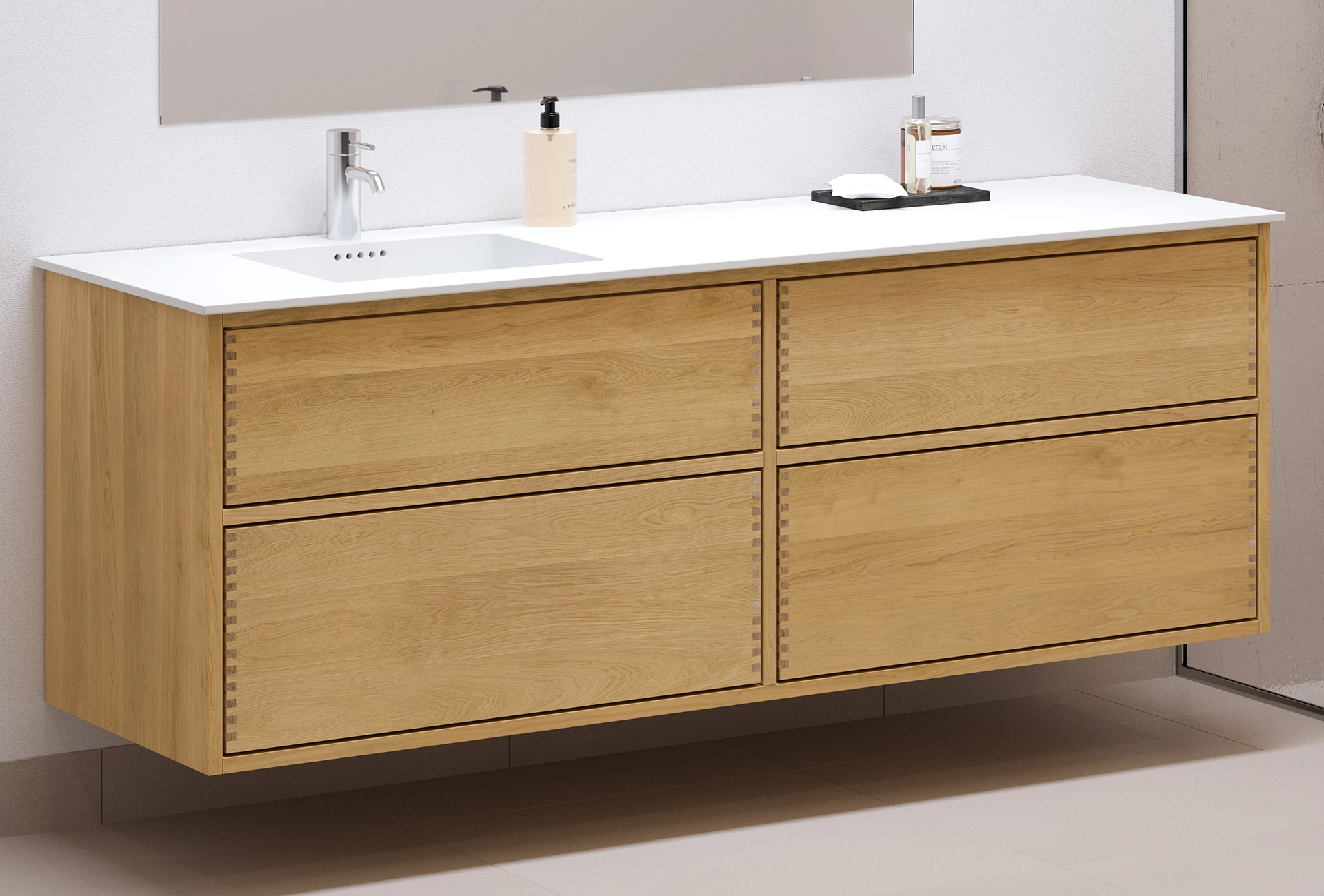 This carpenter bathroom furniture has 4 drawers with push to open. The furniture is made with solid, oiled and finger-jointed oak drawers with beautiful details. The drawers are made with full extension and soft close and come with a washout in the top drawer and full depth in the bottom drawer.