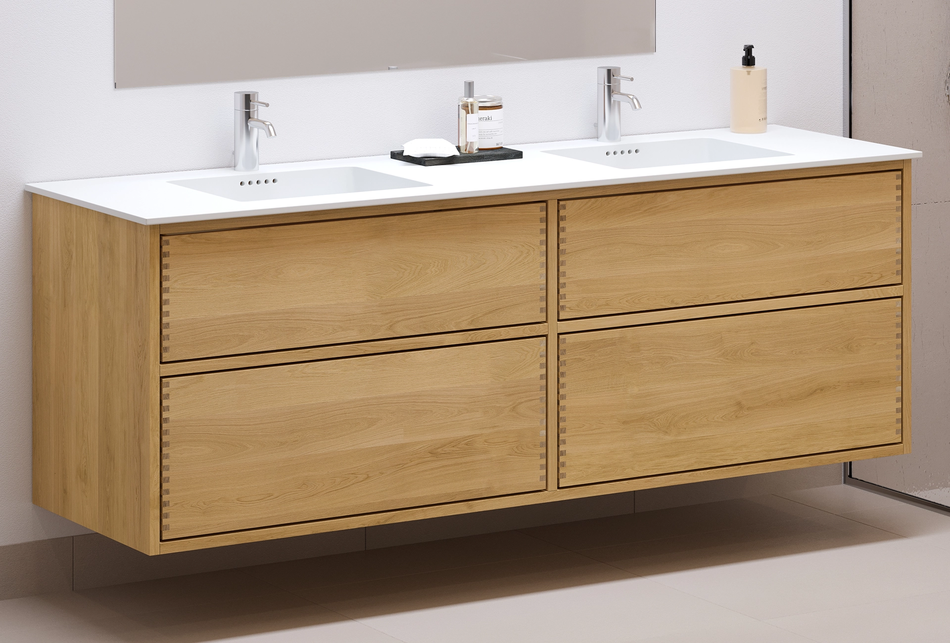 This carpenter bathroom furniture has 4 drawers with push to open. The furniture is made with solid, oiled, and finger-jointed oak drawers with beautiful details. The drawers are made with full extension and soft close and come with a wash basin cutout in the top drawer and full depth in the bottom drawer.