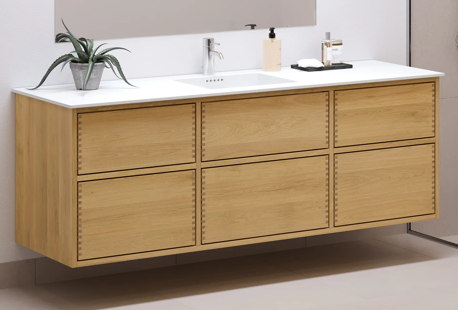 This carpenter bathroom furniture has 6 drawers with push to open. The furniture is made with solid, oiled and finger-jointed oak drawers with beautiful details. The drawers are made with full extension and soft close and come with a sink cutout in the top drawer and full depth in the bottom drawer.