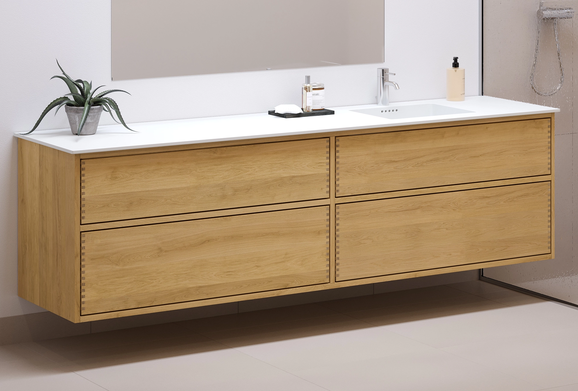 This carpenter bathroom furniture has 4 drawers with push to open. The furniture is made with solid, oiled, and finger-jointed oak drawers with beautiful details. The drawers are made with full extension and soft close, and come with a sink cutout in the top drawer and full depth in the bottom drawer.