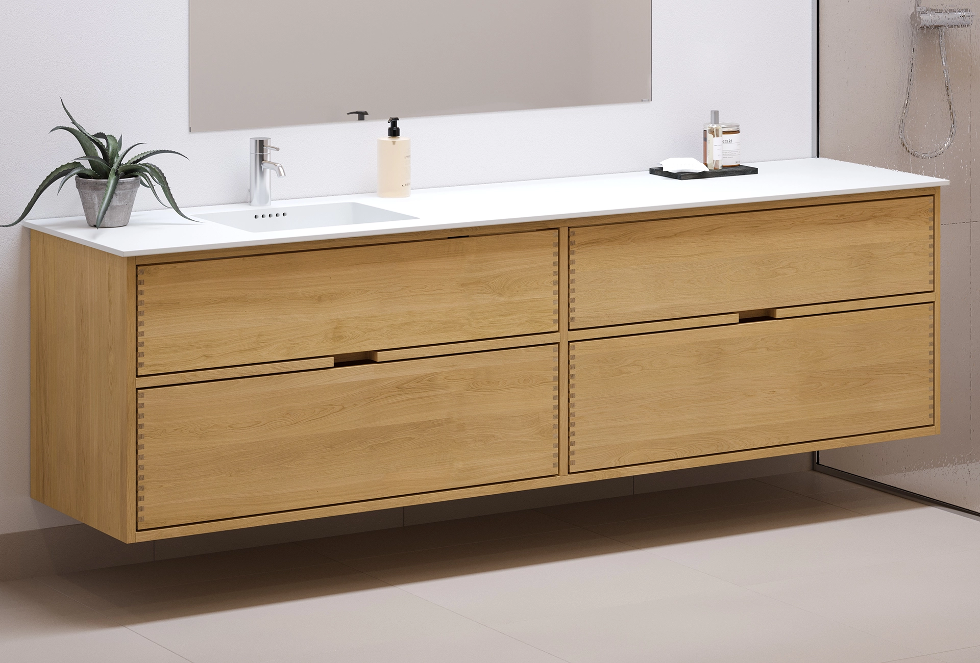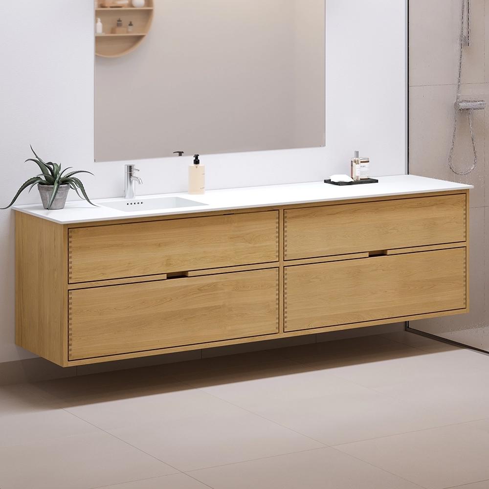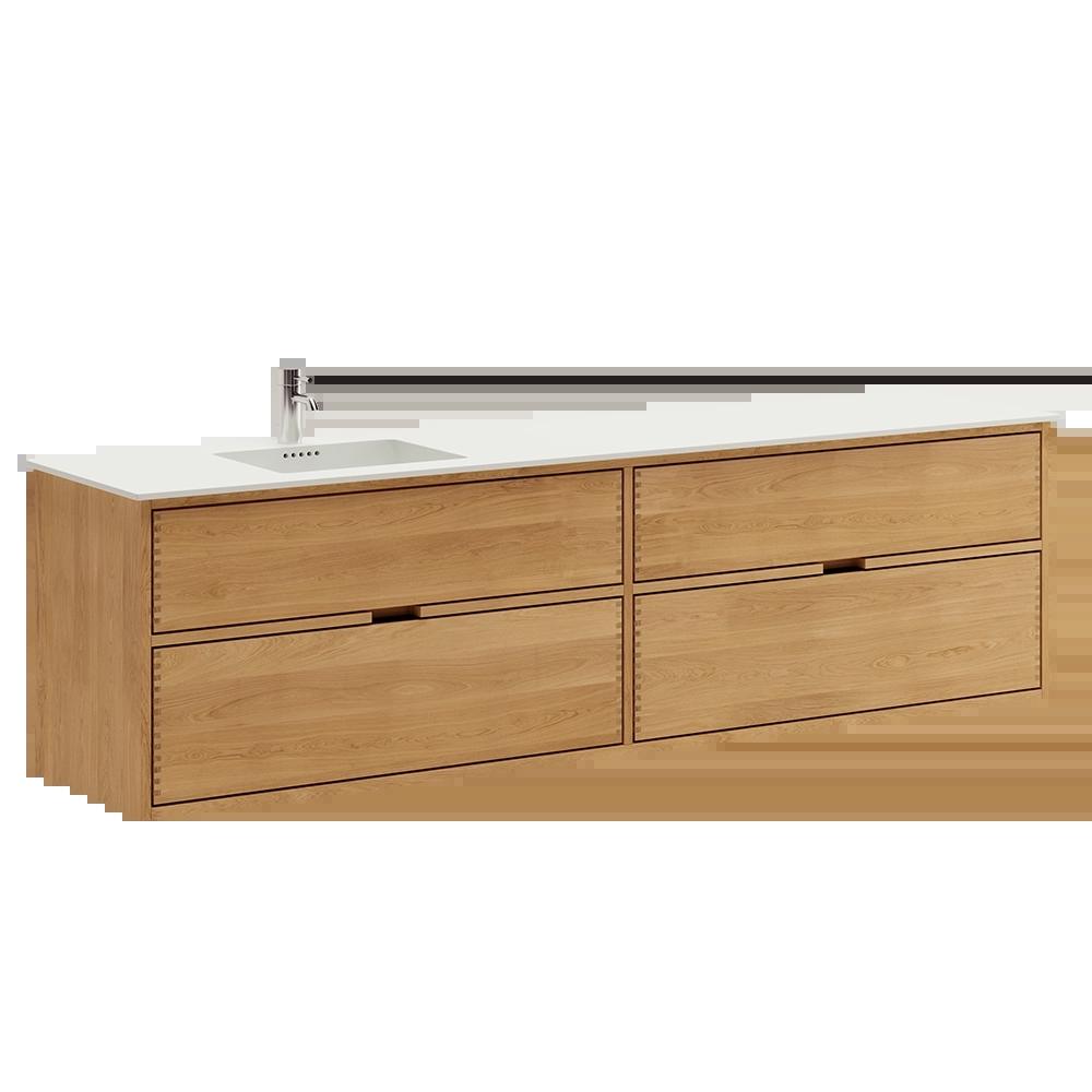 This carpenter bathroom furniture has 4 drawers. The furniture is made with solid, oiled, and finger-jointed oak drawers with beautiful details. The drawers are made with full extension and soft close and come with a sink cutout in the top drawer and full depth in the bottom drawer.