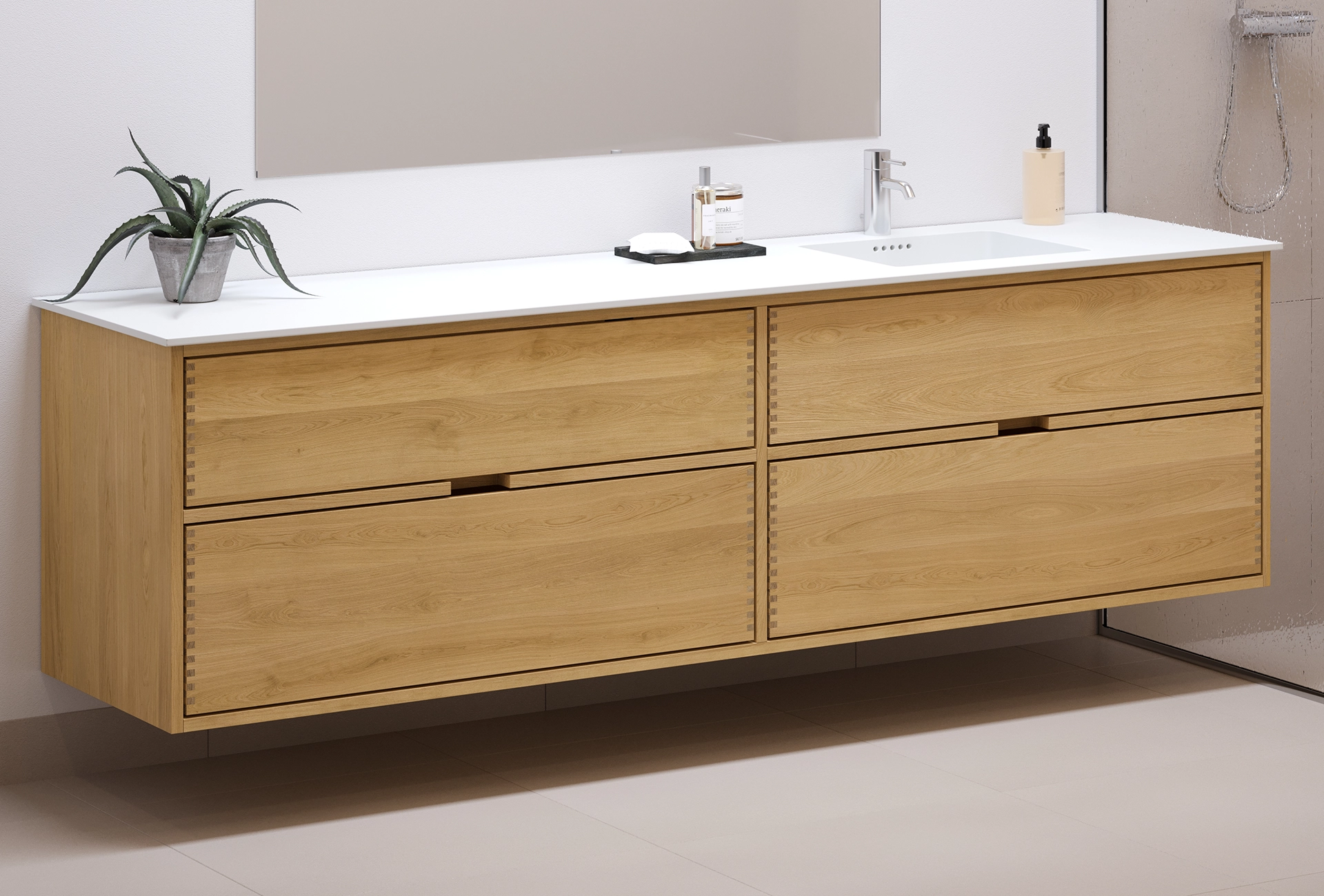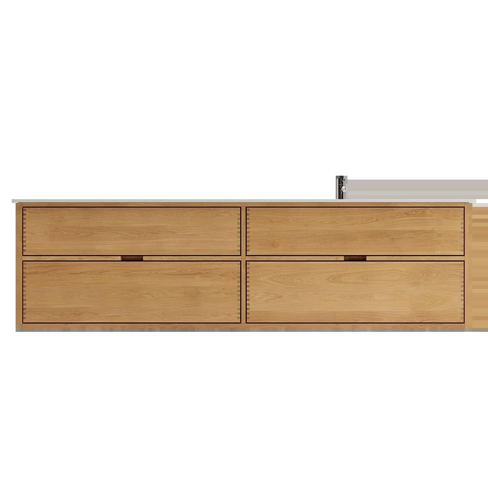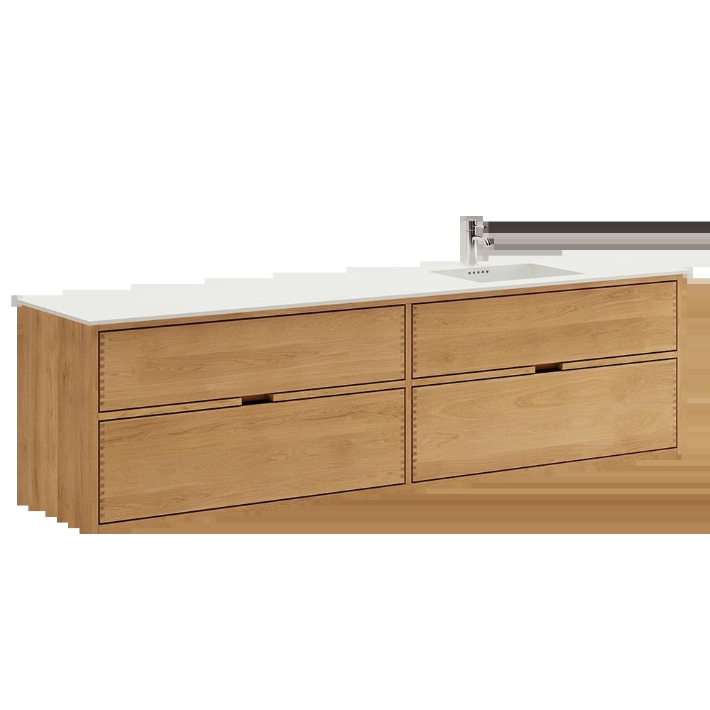 This carpenter bathroom furniture has 4 drawers. The furniture is made with solid, oiled, and finger-jointed oak drawers with beautiful details. The drawers are made with full extension and soft close and come with a wash cutout in the top drawer and full depth in the bottom drawer.