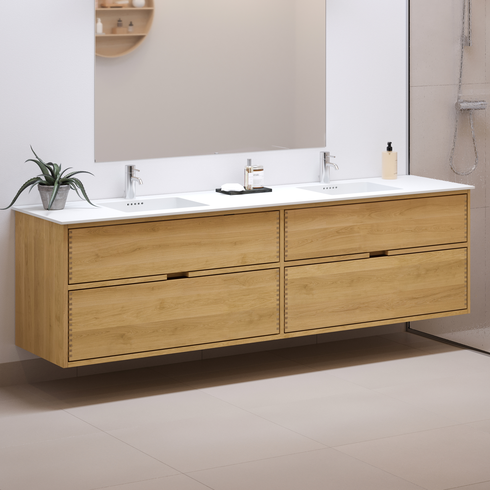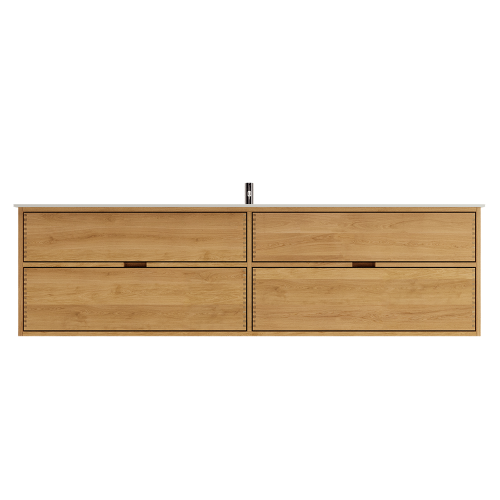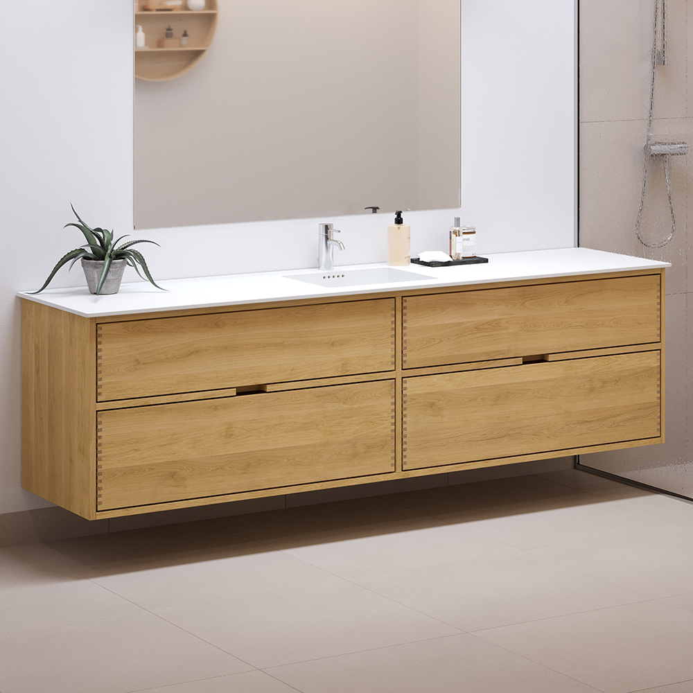 This carpenter bathroom furniture has 4 drawers. The furniture is made with solid, oiled, and finger-jointed oak drawers with beautiful details. The drawers are made with full extension and soft close and come with a sink cutout in the top drawer and full depth in the bottom drawer.